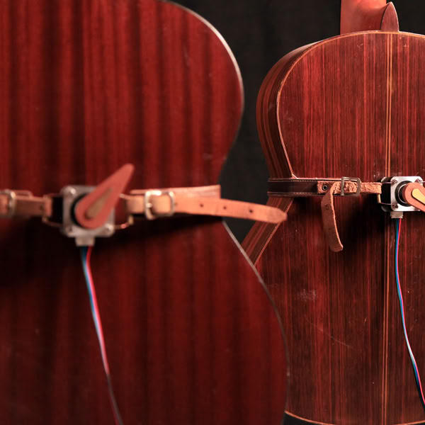 Mehrere auf ihren Resonanzkörper reduzierte Gitarren bilden ein akustisches Ensemble individueller Charaktere – geprägt durch Herkunft, Material und Geschichte. Anstelle der Saiten erzeugen Schrittmotoren über Lederriemen vibrierende Frequenzen, die mikrotonal moduliert werden und ein Klangfeld entstehen lassen, das zwischen mechanischer Präzision und organischer Resonanz oszilliert.