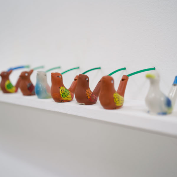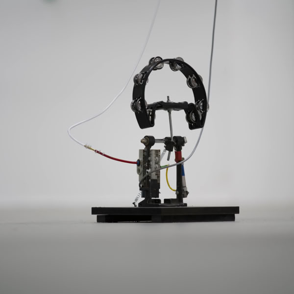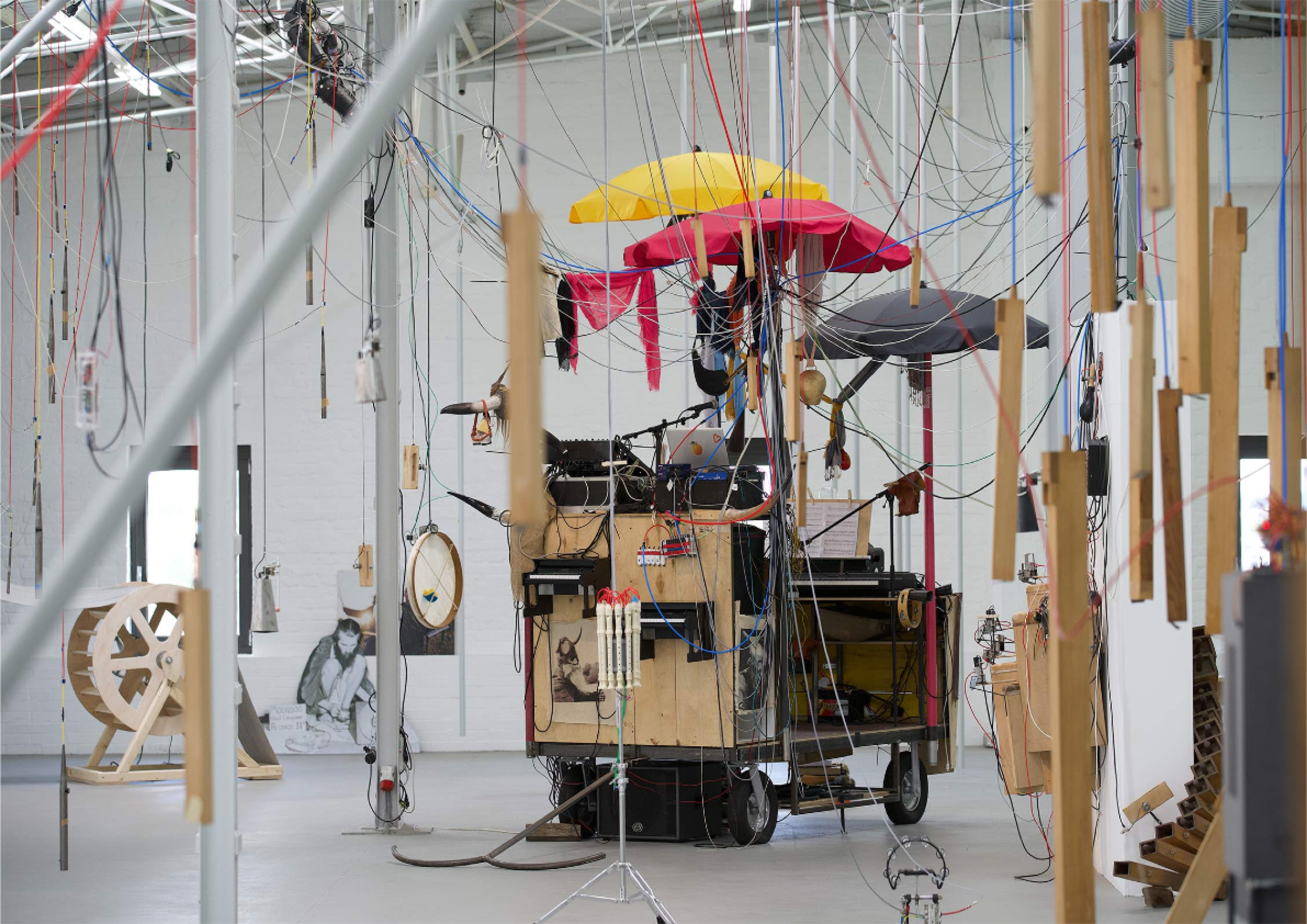 Over the course of the exhibition, the Moon Machine evolves into an installation, extending its tentacles and intertwining with the spaces of the Kunsthalle. The instruments can be closely examined and take center stage as objects. In the absence of the two performers, the machine itself becomes the protagonist. Time and again, sequences developed by the artists emanate from the machine. Like an ensemble, the individual objects interact with one another. Through the multi-layered connection of sculpture and sound, the acoustic sculpture opens up new spaces for perception.