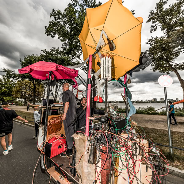 Based on the works of Moondog, composer Thies Mynther and theater maker Veit Sprenger, in collaboration with visual artist Tobias Euler, have created an interventionist music machine. The Moon Machine is a mobile music island, a bricolage featuring pneumatic instruments and mechatronic sound automatons, sun umbrellas, signal horns, and acoustic collision warning devices, played by the two performers Mynther and Sprenger.