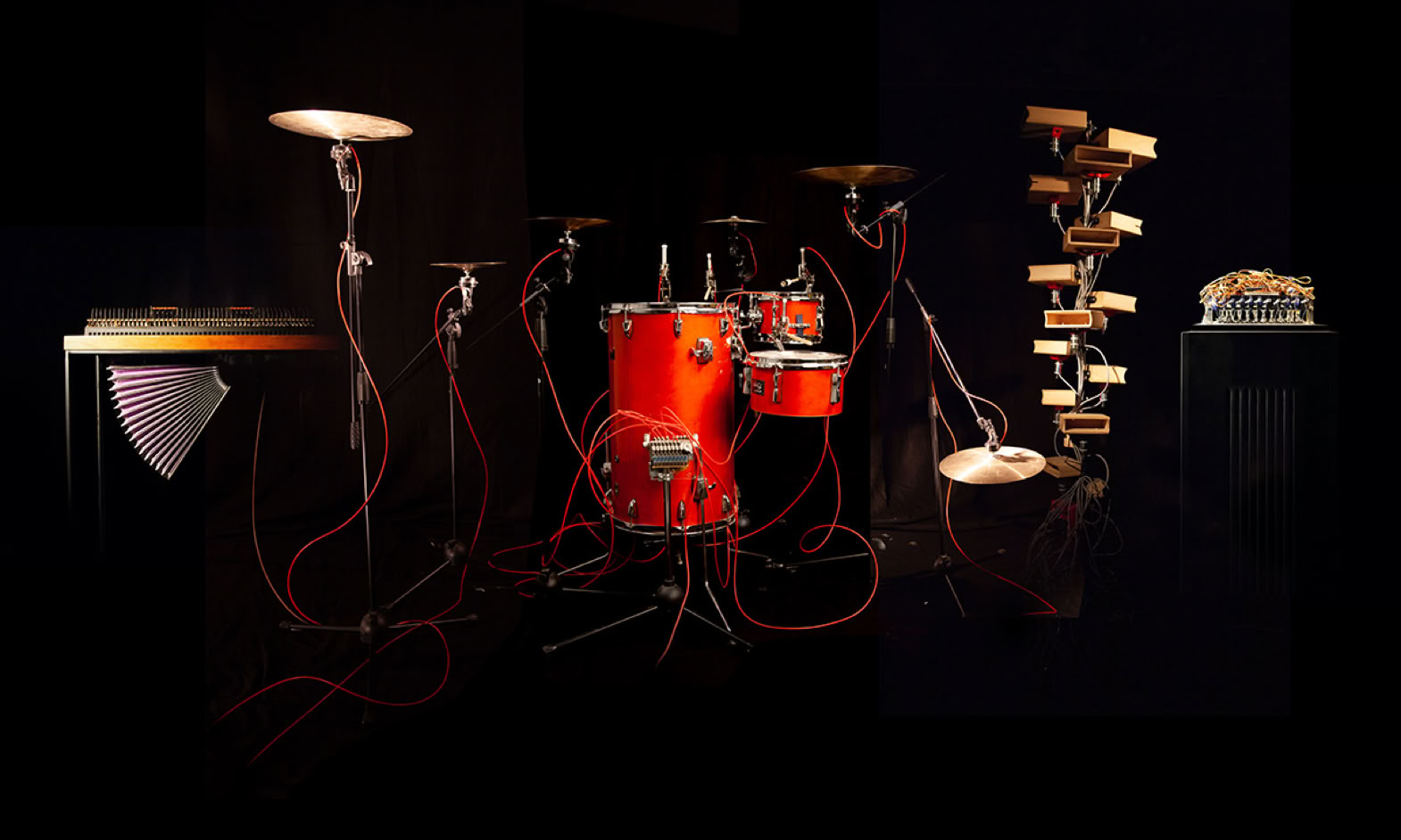 Holz, Stahl, Servomotoren, Gummi, Durchschlagzungen, Wind, elektronische Komonenten 120 x 100 x 90 cm, 2024