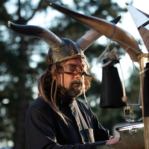 So kam es. Der Comiczeichner Simon Schwartz hat die Geschichte auf einem Blatt seiner Serie „Vita obscura“ erzählt. Eines Tages war Moondog verschwunden – und 1974 tauchte er in der Fußgängerzone von Recklinghausen wieder auf. Er gab Konzerte in Frankfurt, Hannover und Münster, wo er 1999 starb und begraben ist. In der Kunsthalle im Hafenviertel von Münster haben Tobias Euler, Thies Mynther und Veit Sprenger jetzt eine „Moon Machine“ installiert, ein verdrahtetes Ensemble aus Tröten, Trommeln, Triangeln und anderen Weltmusikinstrumenten. Das Kein-Mann-Orchester spielt Tafelmusik für Walhall, von Geisterhand dirigiert oder vom Wechsel der Mondphasen. Ein Heide kehrt heim