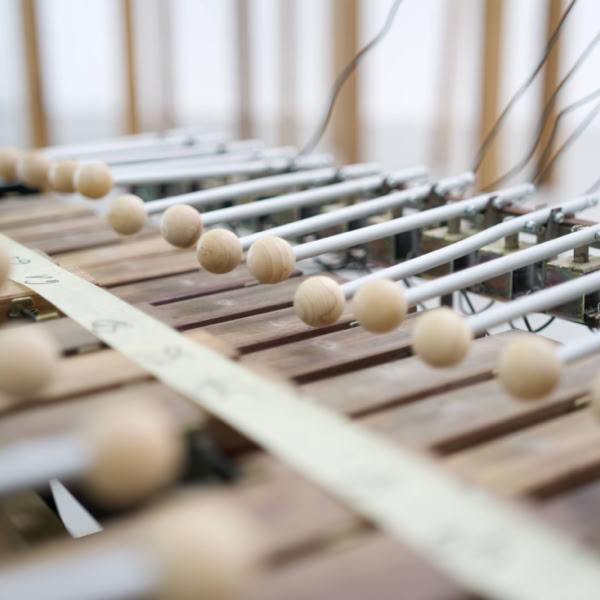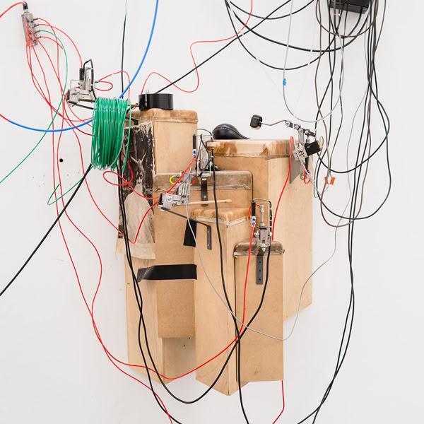Over the course of the exhibition, the Moon Machine evolves into an installation, extending its tentacles and intertwining with the spaces of the Kunsthalle. The instruments can be closely examined and take center stage as objects. In the absence of the two performers, the machine itself becomes the protagonist. Time and again, sequences developed by the artists emanate from the machine. Like an ensemble, the individual objects interact with one another. Through the multi-layered connection of sculpture and sound, the acoustic sculpture opens up new spaces for perception.
