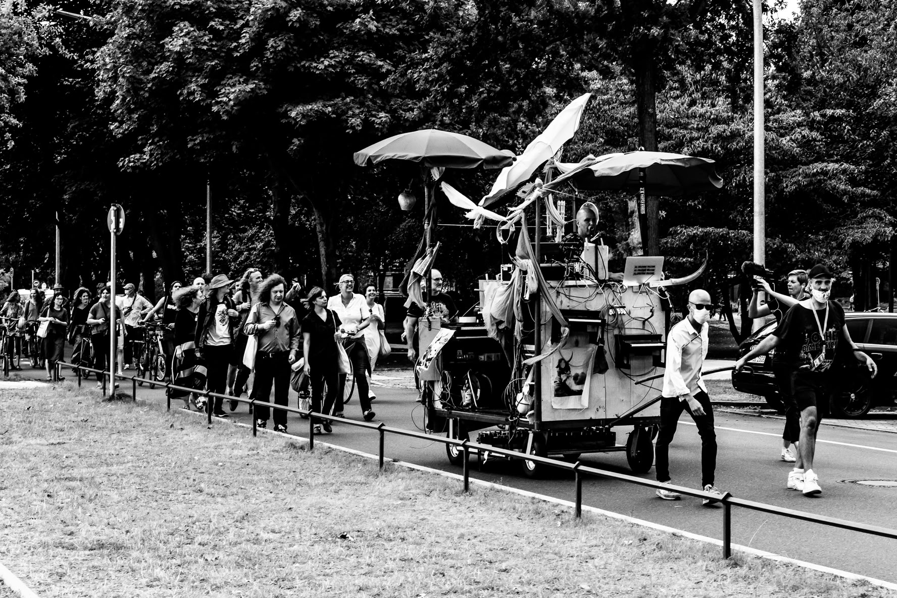 Der Zug setzt sich in Bewegung. „No love, no hate, just parade“, ruft Thies Mynther, der Mann mit dem kahlen Schädel, ins Mikrofon. Die „Moon Machine“ hat der Komponist gemeinsam mit dem Theatermacher Veit Sprenger und dem bildenden Künstler Tobias Euler entwickelt. Während Mynther und Sprenger musizieren, muss Euler, in Shorts und Basecap, das Gefährt wie einen Bollerwagen ziehen. Der Dieselgenerator reicht gerade mal aus, um die Technik mit Strom zu versorgen.