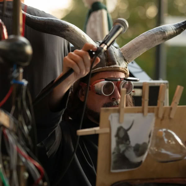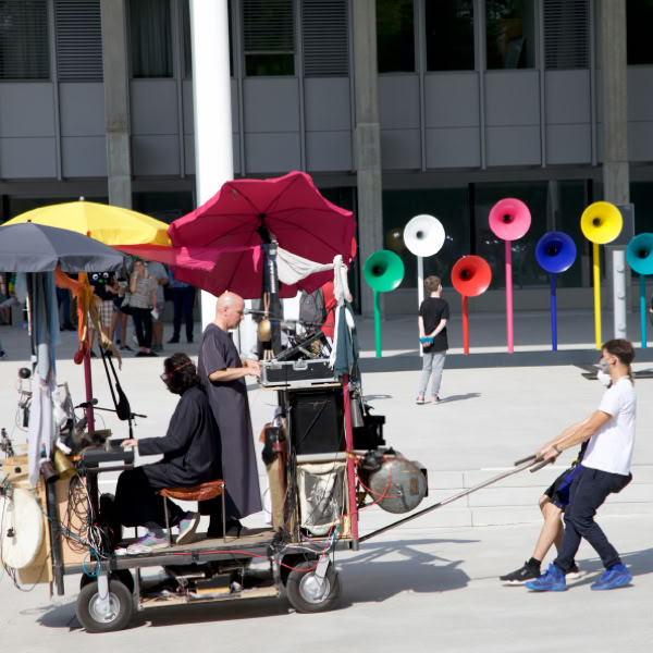 Based on the works of Moondog, composer Thies Mynther and theater maker Veit Sprenger, in collaboration with visual artist Tobias Euler, have created an interventionist music machine. The Moon Machine is a mobile music island, a bricolage featuring pneumatic instruments and mechatronic sound automatons, sun umbrellas, signal horns, and acoustic collision warning devices, played by the two performers Mynther and Sprenger.