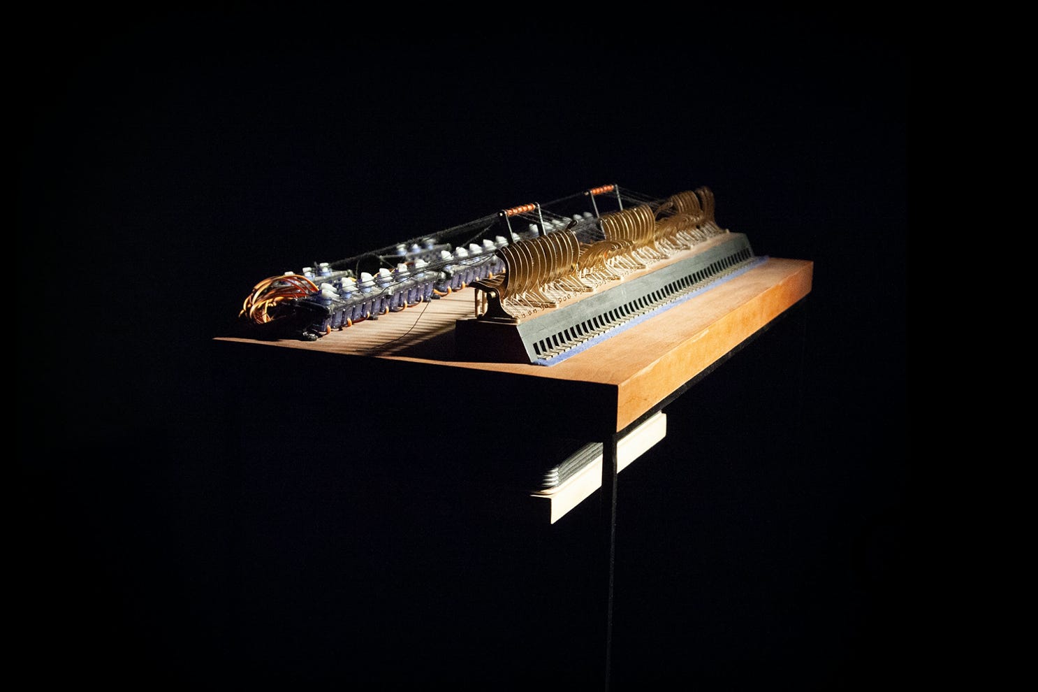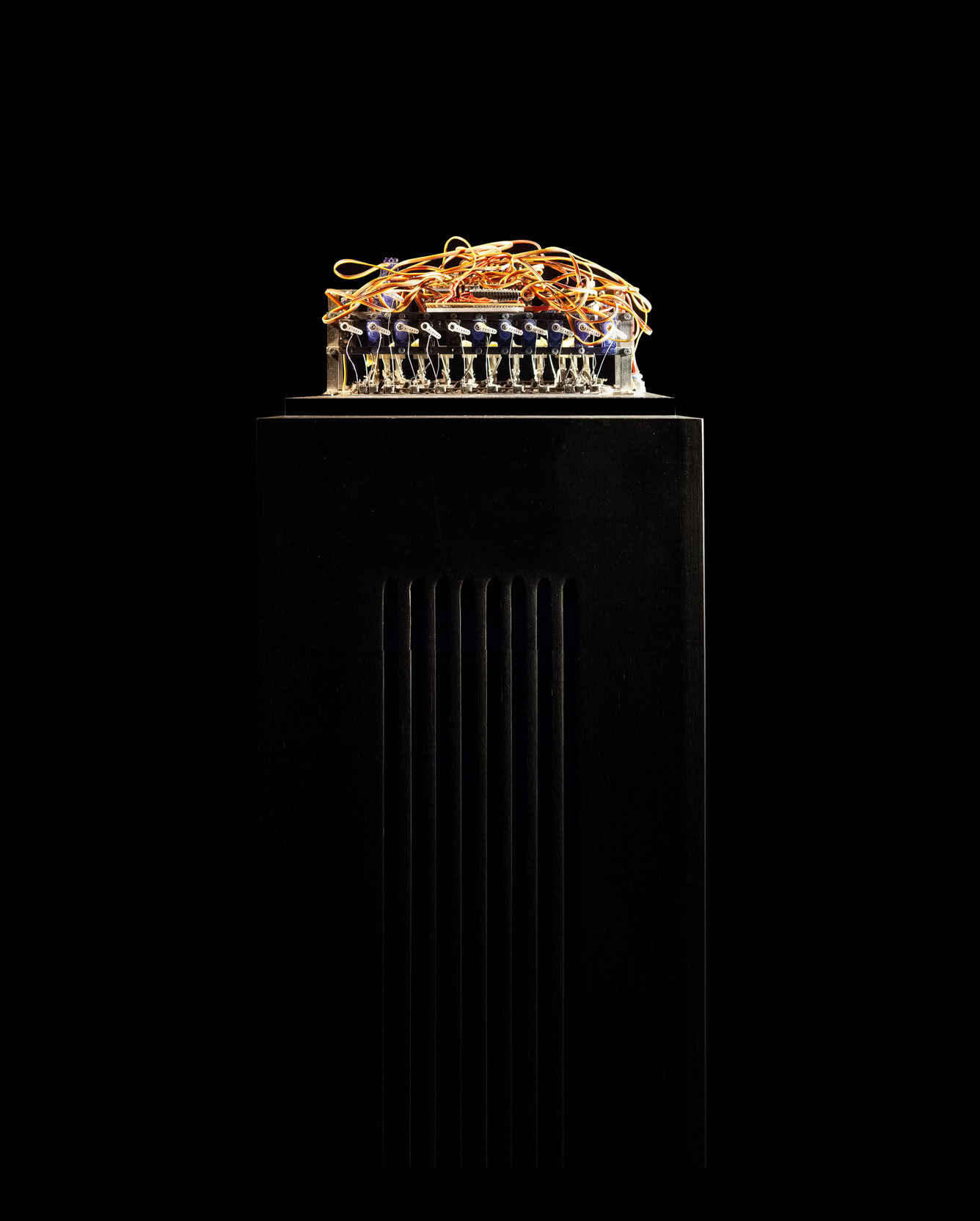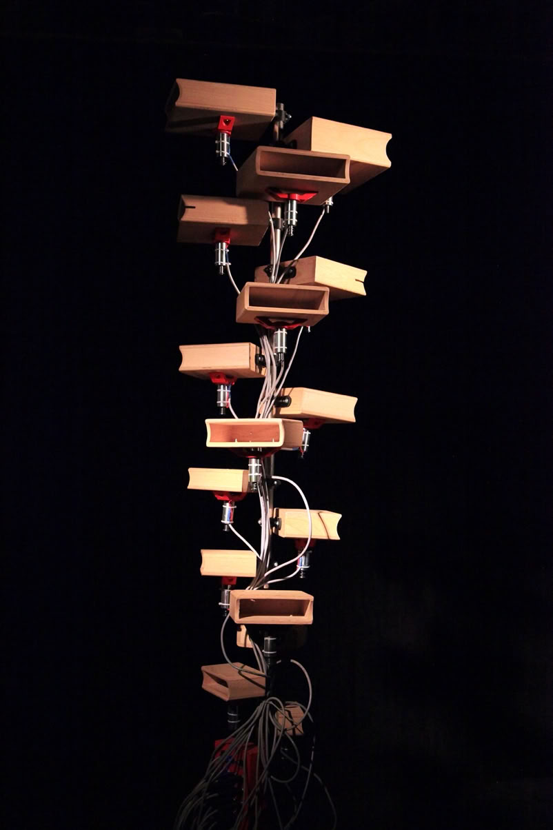 Holz, Stahl, Servomotoren, Gummi, Durchschlagzungen, Wind, elektronische Komonenten 120 x 100 x 90 cm, 2024