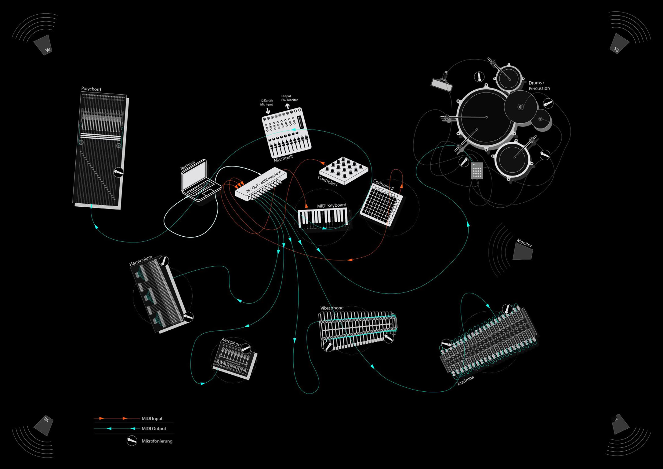 Die Verarbeitung des musikalischen Inputs erfolgt mit Hilfe einer speziell entwickelten Software, die auf Max/MSP und dem Machine Learning Toolkit ml.star basiert. Dabei werden die Eingaben durch Markov- Modellierungen analysiert und interpretiert. Die Ergebnisse dieser Prozessierung werden über digital gesteuerte Klangobjekte ausgegeben. Die Software ermöglicht eine iterative Verarbeitung, wodurch die Inter- aktion zwischen Mensch und Maschine dynamisch gestaltet wird.